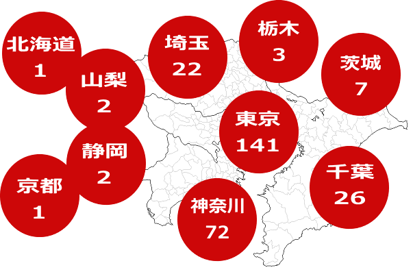 | 東京 | 23区(台東・杉並・目黒・世田谷・新宿・渋谷・足立・荒川・北・千代田・中央・品川・葛飾・板橋・江戸川・港・文京・大田・中野・墨田・豊島・練馬・江東)・国立市・西東京市・昭島市・武蔵野市・三鷹市・武蔵村山市・町田市・府中市・国分寺市 |